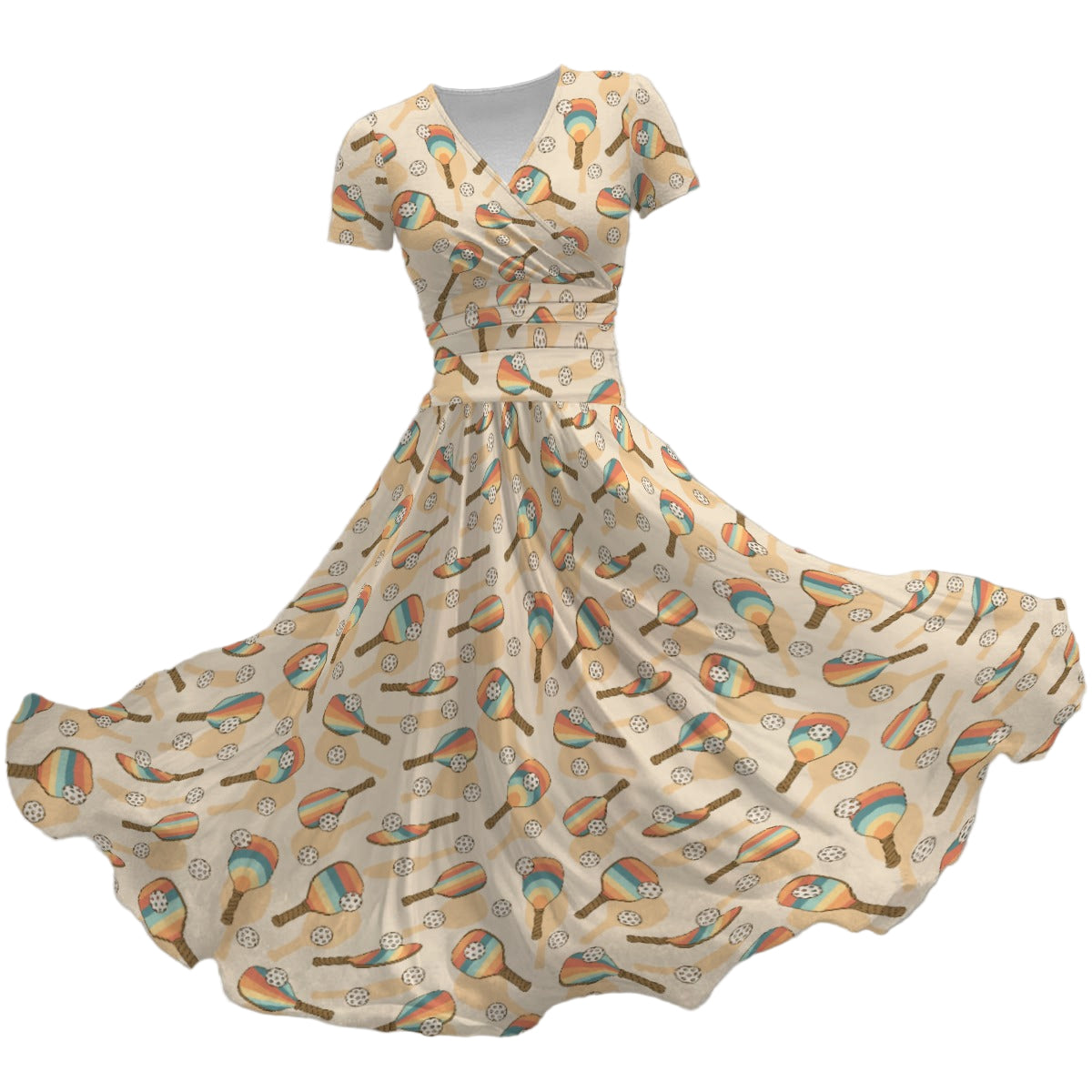 Serve up vintage vibes with this retro pickleball print, featuring striped paddles and balls in warm shades of orange, teal, and gold on a soft tan background. A perfect blend of sporty and nostalgic style.