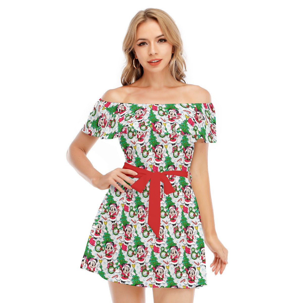 Santa Mouse with Sparkle - Women's Off-shoulder Ruffle Dress