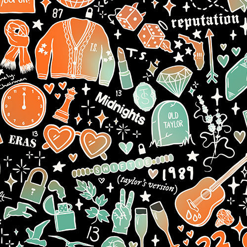 Step into the spotlight with this dazzling collage in mint green and orange! Packed with iconic references from every musical era—folklore forests, midnight clocks, reputation snakes and disco balls, vintage polaroids, lover hearts and butterflies, fearless castles, red scarves, cozy cardigans, champagne problems, and so much more—all rendered in a dreamy pastel palette. Hand-drawn doodles, album hints, lyric nods, and hidden Easter eggs are scattered across a bold black background. It's theatrical, it's nostalgic, and it's perfect for any superfan who's ready to take center stage.
