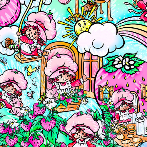 Welcome to the sweetest corner of the 80s! A beloved berry-loving heroine is living her best life in this hand-drawn pattern, complete with her iconic pink bonnet, adorable cat companion, and a garden bursting with strawberries and blossoms. The sketchy black outlines and soft watercolor washes in pink, turquoise, and green capture that vintage storybook charm, while sunny skies, rainbows, and a cozy little cottage add to the whimsical vibe. It's sugary, it's nostalgic, and it's basically a hug from your childhood.
