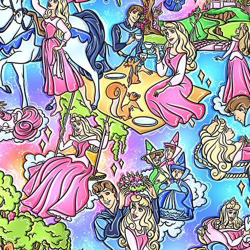 Once upon a dream, everything is pink, blue, and absolutely chaotic! This vibrant collage captures every iconic moment from a beloved fairy tale: a princess dancing with her prince in the forest, three bickering fairies arguing over cake and dress colors, a villainous sorceress lurking with her raven, the spinning wheel that started it all, and a majestic castle perched on rolling green hills. The hand-drawn comic book style bursts with bold outlines, pastel pinks and blues, and a dreamy watercolor sky. It's whimsical, it's nostalgic, and it's perfect for any fan who knows true love conquers all.