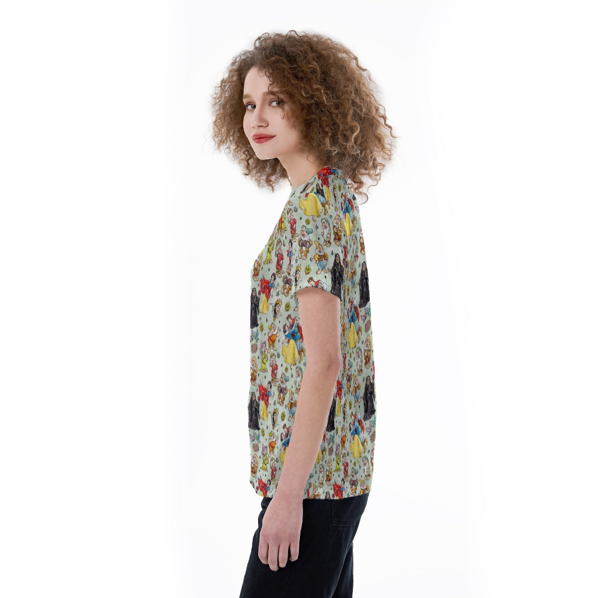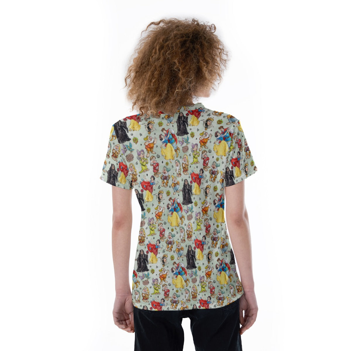 This playful hand-drawn design features a fair princess, her seven devoted helpers, a dramatic royal villain, and enchanted extras like poisoned apples and woodland creatures. Sketched with vintage charm and sprinkled with nostalgic magic, it’s a timeless tribute to classic animated royalty.
