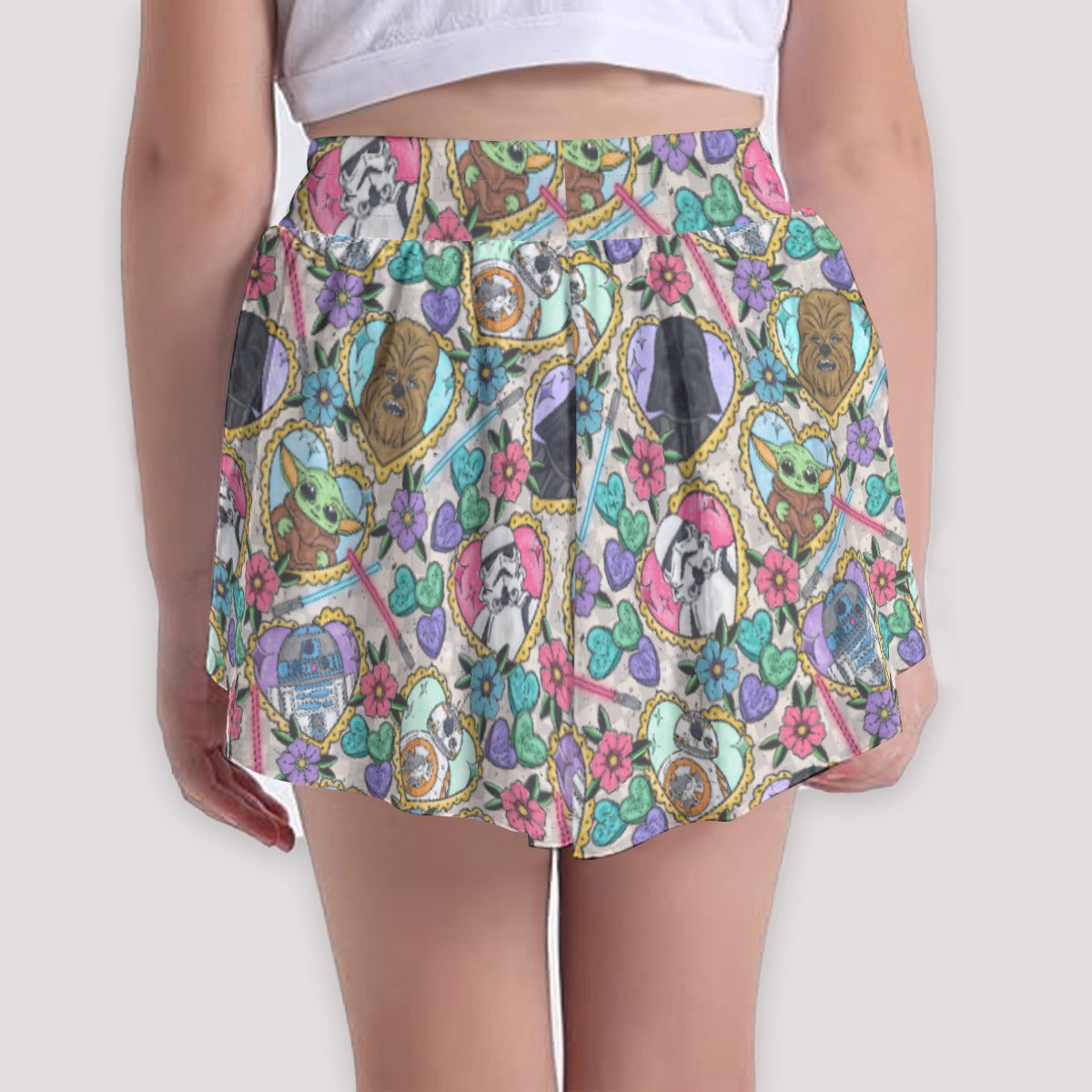 Iconic space heroes and droids appear inside colorful tattoo-style hearts, surrounded by florals and bold patterns on a checkered backdrop. This design brings cosmic adventure and retro tattoo vibes together for a playful and striking tribute to legendary friends from a galaxy far, far away.