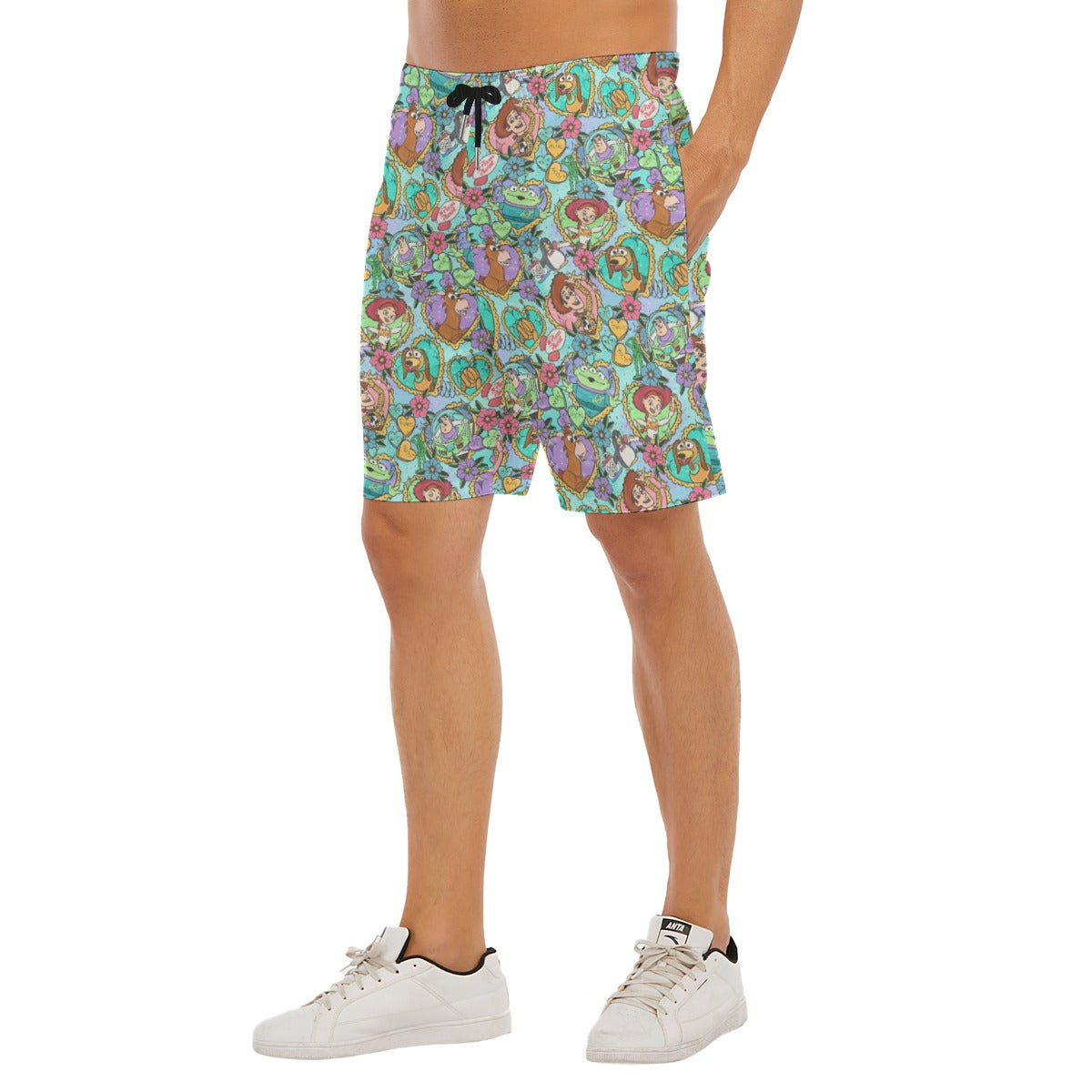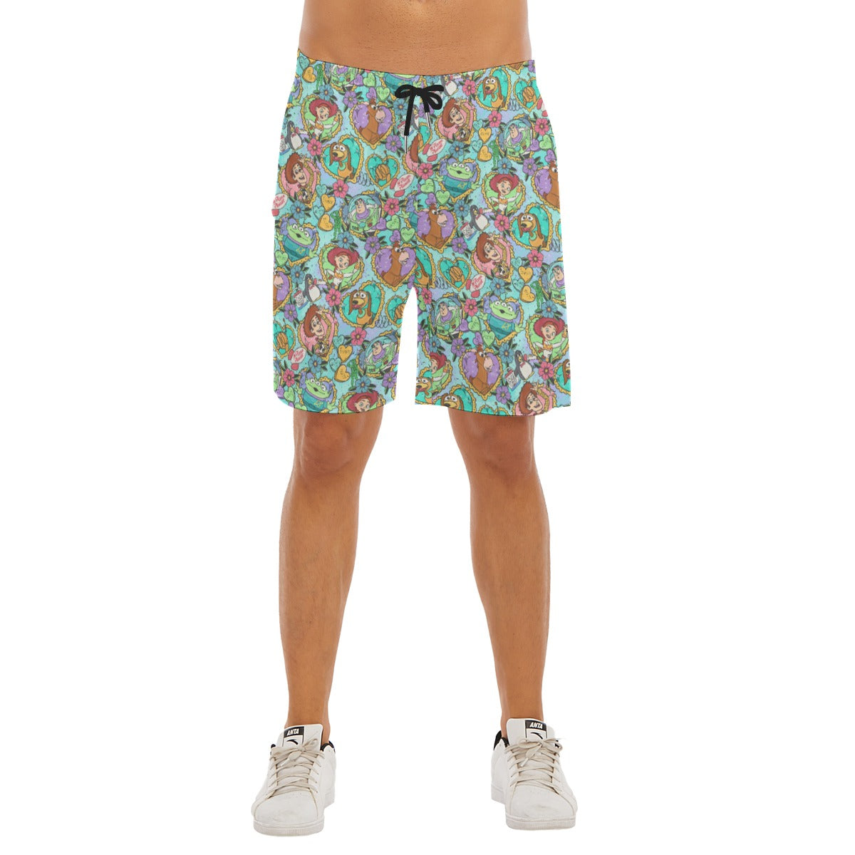 This colorful tattoo-style print captures a beloved space-themed crew inside playful hearts, sprinkled with stars, florals, and nostalgic nods like pizza rockets and famous catchphrases. Set on a sky-blue background, it’s a fun-filled homage to adventure and friendship with a retro ink vibe.