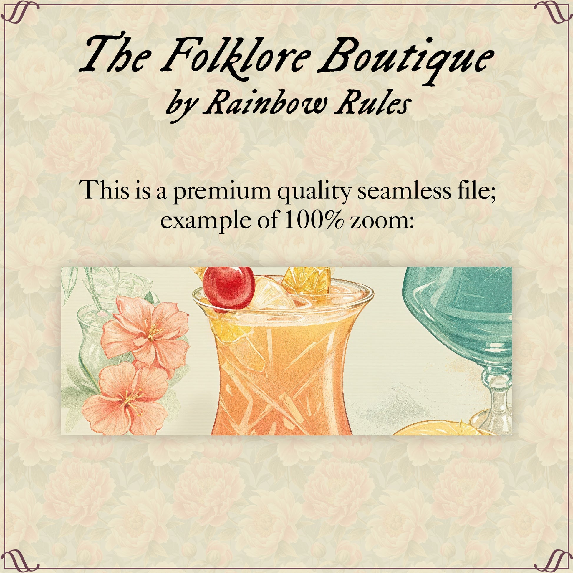 Tropical Cocktails and Summer Fruit Delight - premium quality Seamless Pattern in 12x12", JPG, 300 DPI.
