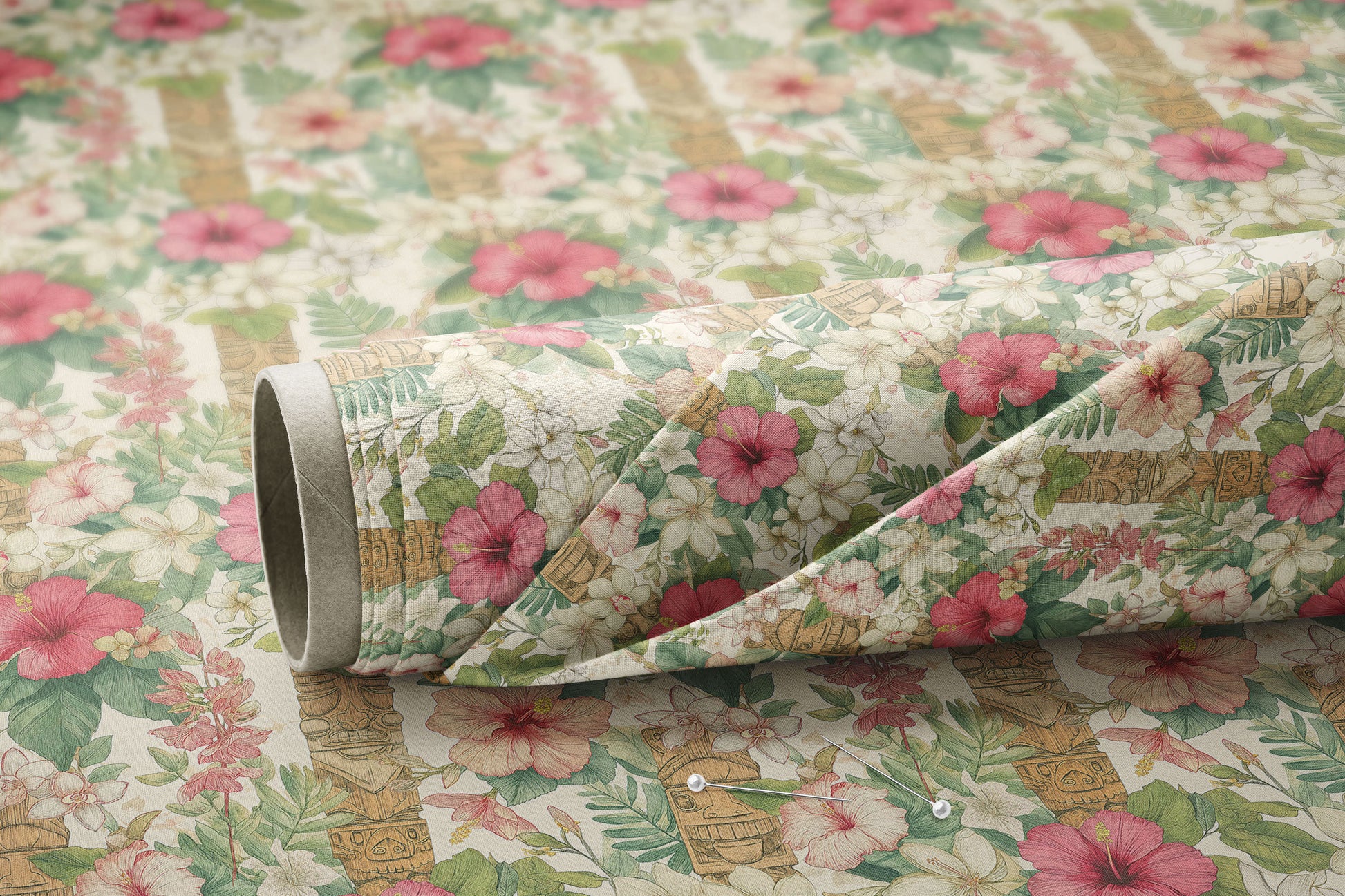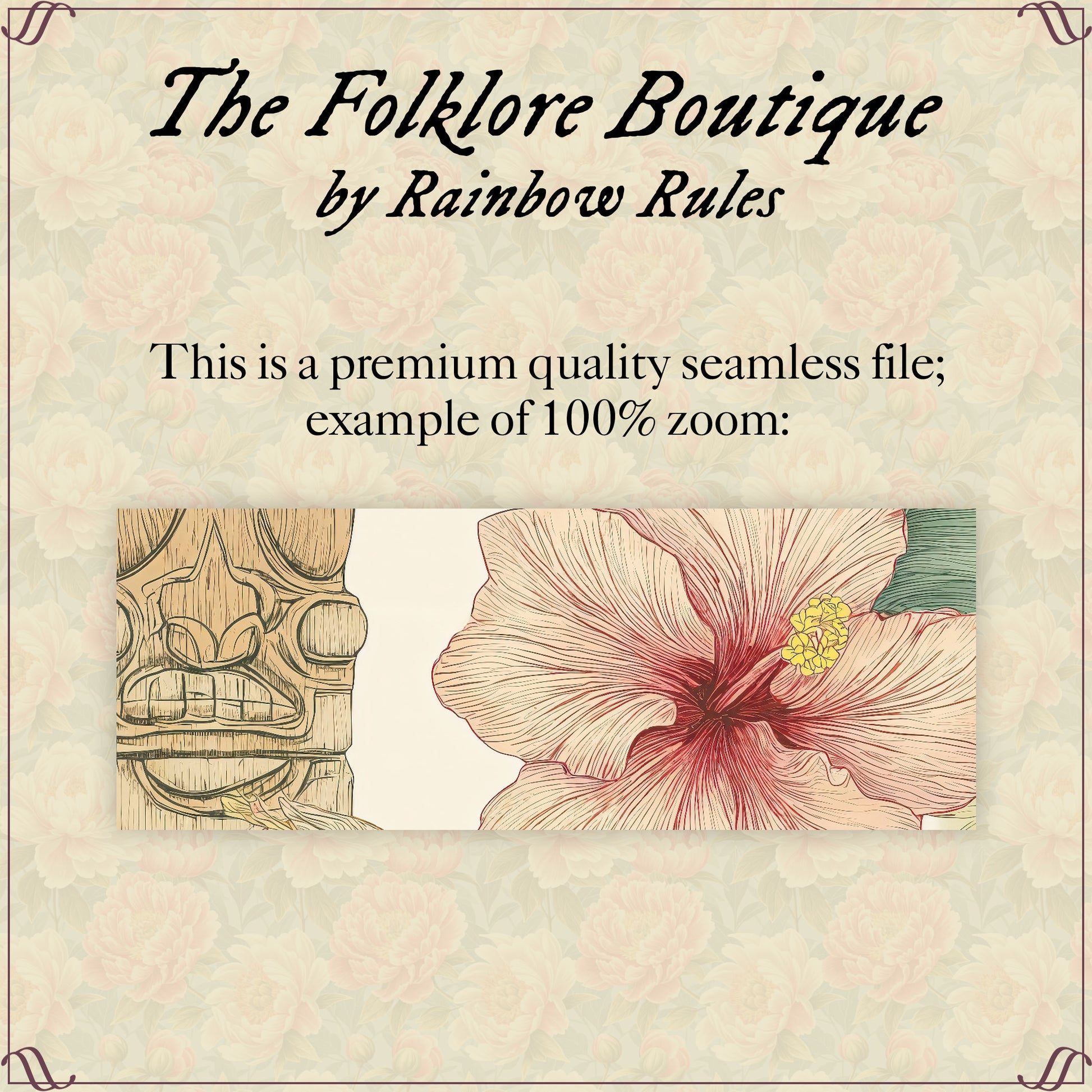 This seamless design evokes a dreamy Polynesian escape, where carved wooden tiki statues peek through a lush paradise of hibiscus, plumeria, and tropical foliage. The hand-drawn botanical style and gentle pastel tones bring vintage charm to this whimsical island garden. Perfect for lovers of boho beach vibes and exotic floral flair.