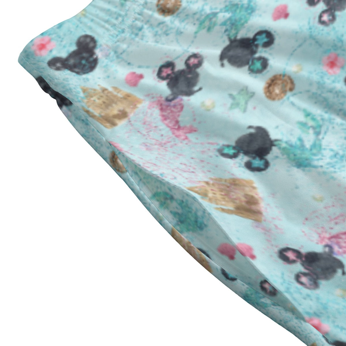 Dive into seaside whimsy with this playful watercolor design where glittery pink and teal mermaid tails meet classic mouse ears. Featuring sandy castles, ocean swirls, star-studded bows, and seashell sparkles in dreamy beachy pastels, it’s a swirl of undersea sass and charming coastal style.